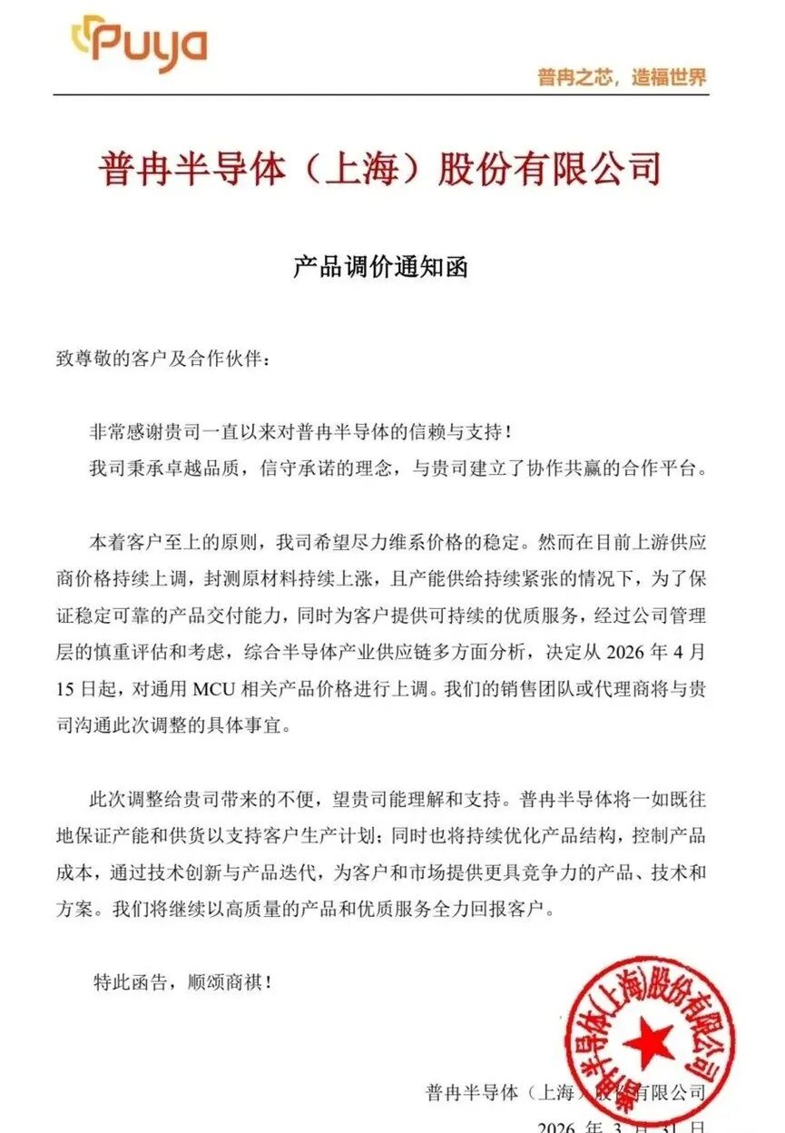 普冉股份发布产品调价通知函,宣布自2026年4月15日起,对通用MCU相关产品价格进行上调。