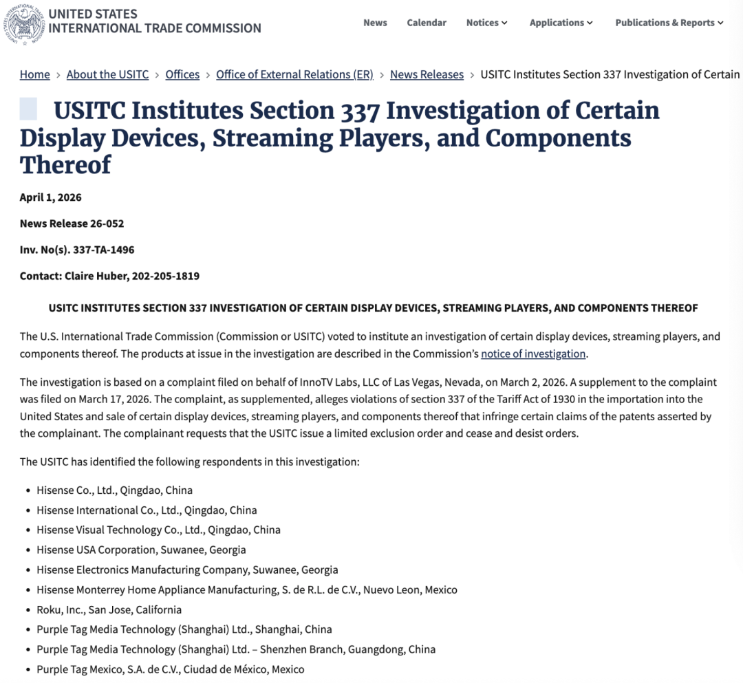 据悉,本次调查的发起源于美国内华达州拉斯维加斯的InnoTV Labs, LLC公司的申诉。该公司于2026年3月2日首次向USITC提交申诉,并在3月17日补充了相关材料,进一步明确申诉主张。补充后的申诉指出,部分进口及在美销售的显示设备、流媒体播放器及其组件,涉嫌违反美国1930年《关税法》第337条规定,侵犯了该公司所持有的6项美国注册专利(专利号分别为7,965,918、12,096,066、10,018,863、RE50,251、11,714,306、12,038,636),据此申诉方向USITC提出申请,请求发布有限排除令及禁止令,以此遏制相关侵权产品的进口与销售,维护其自身专利权益。