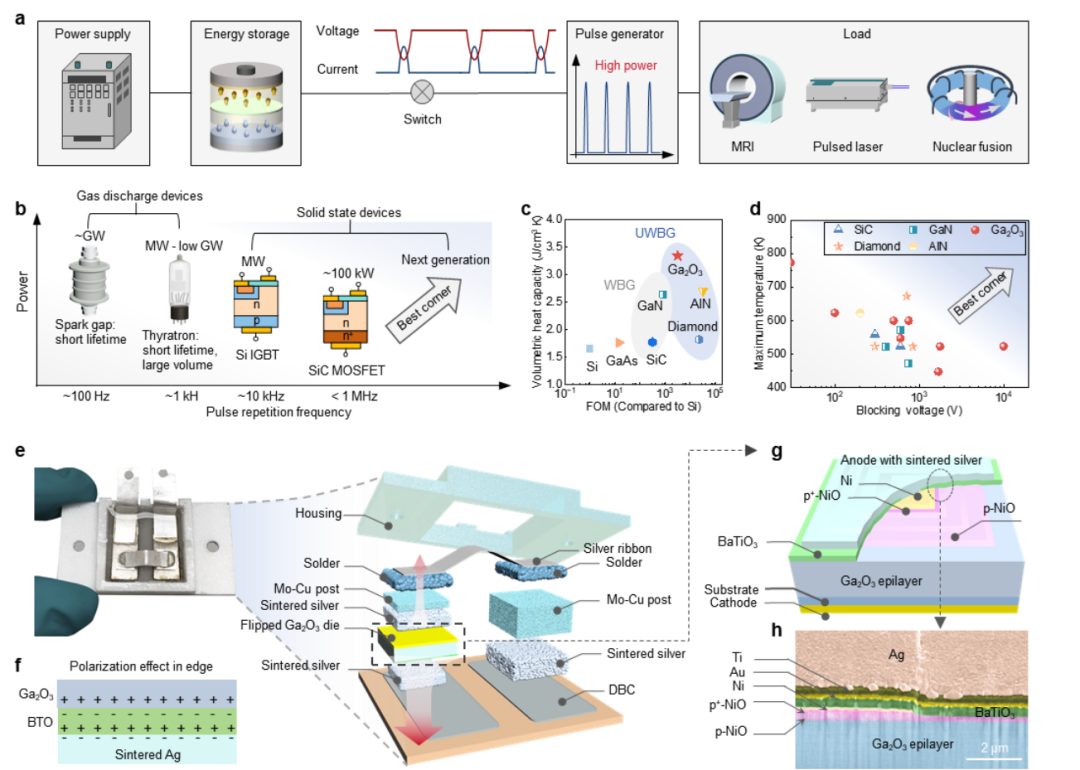 图1:脉冲功率应用、材料选择与器件-封装设计。(a) 脉冲功率系统示意图及开关电压电流特性;(b) 现有脉冲器件功率与频率范围及下一代需求;(c) 主流功率半导体体积比热容与性能指标对比;(d) 宽禁带与超宽禁带器件最高工作温度与阻断电压对比;(e) Ga2O3子模块封装结构示意图与实物图;(f) 高κ介质引入极化电荷调控电场示意图;(g-h) 高κ界面器件三维结构及截面SEM图。