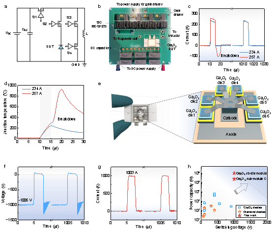 图2:兆瓦级脉冲功率开关实验验证。(a-b) 脉冲功率开关测试电路示意图与实物图;(c-d) Ga2O3子模块的开关电流波形及结温演化;(e) 集成6个子模块的Ga2O3功率模块结构实物图及三维结构图;(f-g) 模块在兆瓦级脉冲条件下的电压、电流开关波形;(h) 本工作与已报道超宽禁带器件的功率容量与开关电压对比。