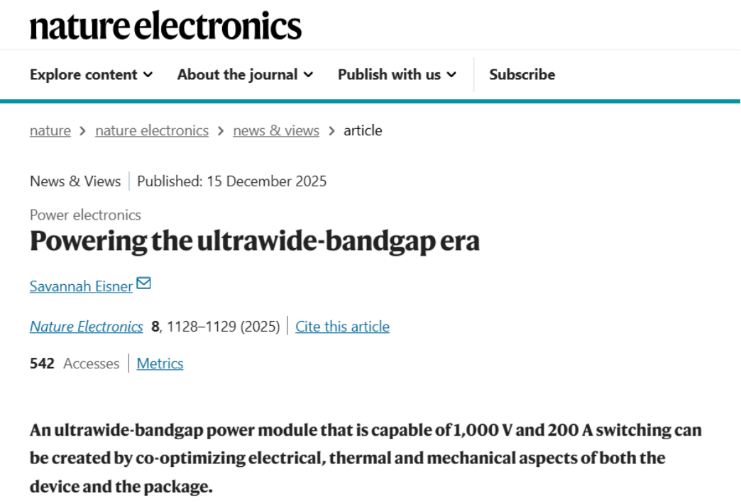 此外,团队早期关于第四代半导体器件封装的电-热-应力协同优化的研究成果以题目“First Demonstration of an Ultra-Wide Bandgap Power Module through Device-Package, Electro-Thermo-Mechanical Co-Optimization”发表在IEDM 2025会议上,并入选“IEDM 2025技术亮点”(全部投稿前1.5%,中国仅三篇,第三、四代半导体领域唯一一篇)。该工作被Nature Electronics评选为IEDM 25会议十一项研究亮点之一进行专题报道,展现了团队系列工作的重要学术影响力和技术引领价值。