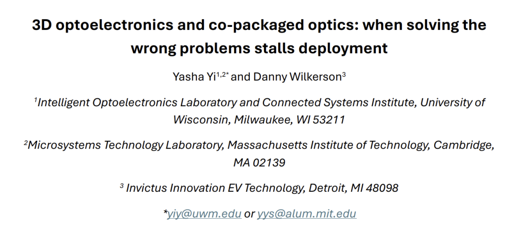 人工智能和加速器驱动型工作负载的快速增长正迫使数据中心的光互连架构进行根本性的重新思考。共封装光学器件和三维光子集成已成为克服电I/O能耗和带宽限制的有效解决方案。然而,随着光学器件与计算的融合日益紧密,封装、散热管理和系统级鲁棒性在性能和可扩展性方面的重要性也日益凸显。