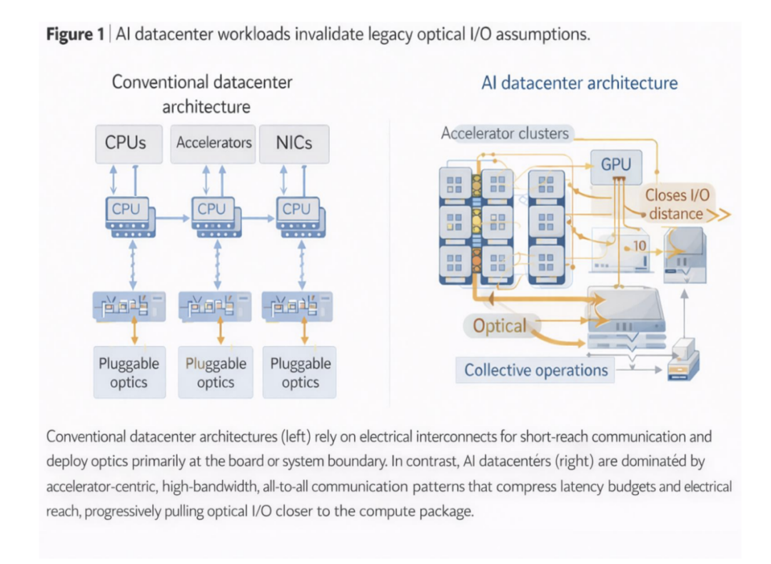 人工智能 (AI) 工作负载的快速增长正在以前所未有的速度重塑数据中心设计,这种速度远远超过了人们对光输入/输出 (I/O) 的长期认知。几十年来,光互连一直被视为外围使能技术——高带宽、高能效的链路,可以独立于计算进行升级。然而,这种抽象概念如今正在瓦解。随着 AI 加速器数量和功率密度的不断增长,光 I/O 不再是一个可分离的子系统,而是一个制约架构、封装和系统可靠性的结构性要素。