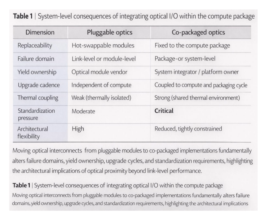 早期的CPO演示自然而然地强调了关键指标:降低每比特能耗、提高总带宽和缩小尺寸。这些结果验证了短距离光I/O的物理优势,但也掩盖了新出现的系统级限制。在高度集成的AI节点中,单个光接口的故障或性能下降可能会影响整个封装,而不仅仅是可更换的模块。异构芯片的良率损失会累积,而围绕热插拔光学元件设计的维护模型不再适用。以往认为光学元件是系统边缘可维护的端点的假设,与AI规模的集成越来越不兼容。