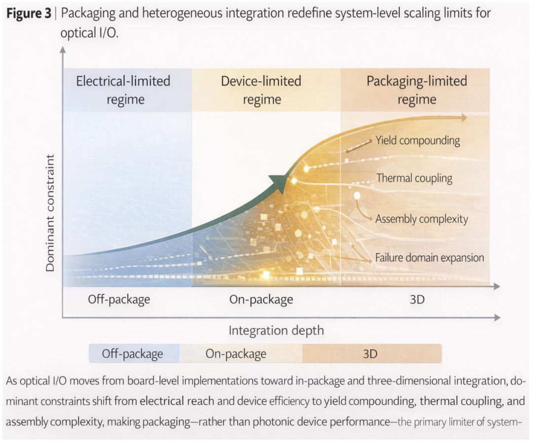 从历史上看,光互连技术的进步主要取决于器件层面的改进。更快的调制器、更低损耗的波导和更高效的光源能够相对直接地转化为系统性能的提升。封装主要作为使能层,负责电气布线和机械支撑。但在人工智能数据中心,这种层级关系发生了逆转。由于光引擎被嵌入到计算封装内部或与其相邻,封装不再是被动的基础设施;它主动地限制了热性能、良率、集成密度和可维护性。这些限制因素与系统尺寸呈非线性关系,往往会抵消器件层面取得的增量性能提升。
