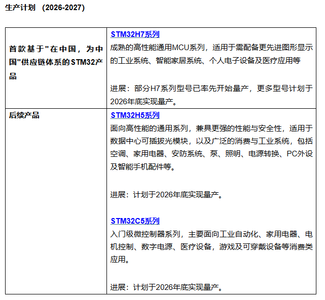 产品已陆续发货给国内客户。这一里程碑标志着意法半导体全球供应链战略的重大进展。公司计划2026年将有更多STM32产品系列(包括高性能、安全及入门级的