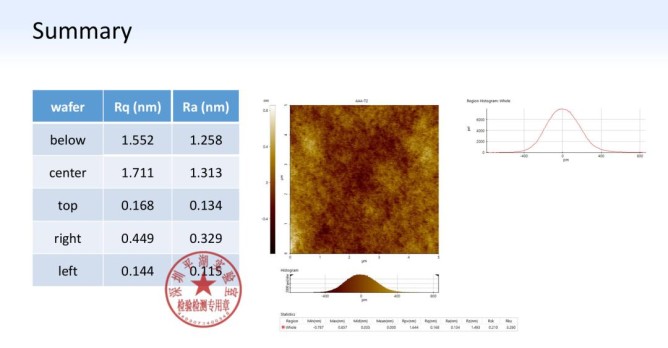 本次检测中,平湖实验室对镓仁半导体8英寸氧化镓同质外延片选取五个关键点位进行AFM(原子力显微镜)与XRD(X射线衍射)联合测试。