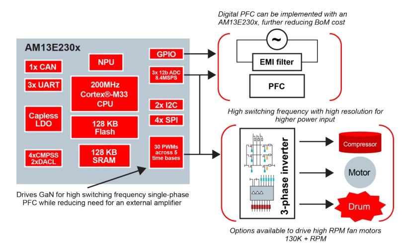 工程师可以使用 AM13E230x MCU 来优化洗衣机电机控制设计——通过运行 AI 模型持续实时监测电机负载,并根据衣物重量自动调整扭矩和速度曲线,从而防止电机应变。图 2 展示了使用 AM13E230x MCU 的洗衣机电机控制系统的简化方框图。