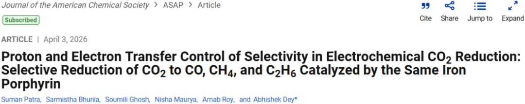 Suman Patra, Sarmistha Bhunia, Soumili Ghosh, et al. Proton and Electron Transfer Control of Selectivity in Electrochemical CO₂ Reduction: Selective Reduction of CO₂ to CO, CH₄ and C₂H₆ Catalyzed by the Same Iron Porphyrin. J. Am. Chem. Soc. (2026)