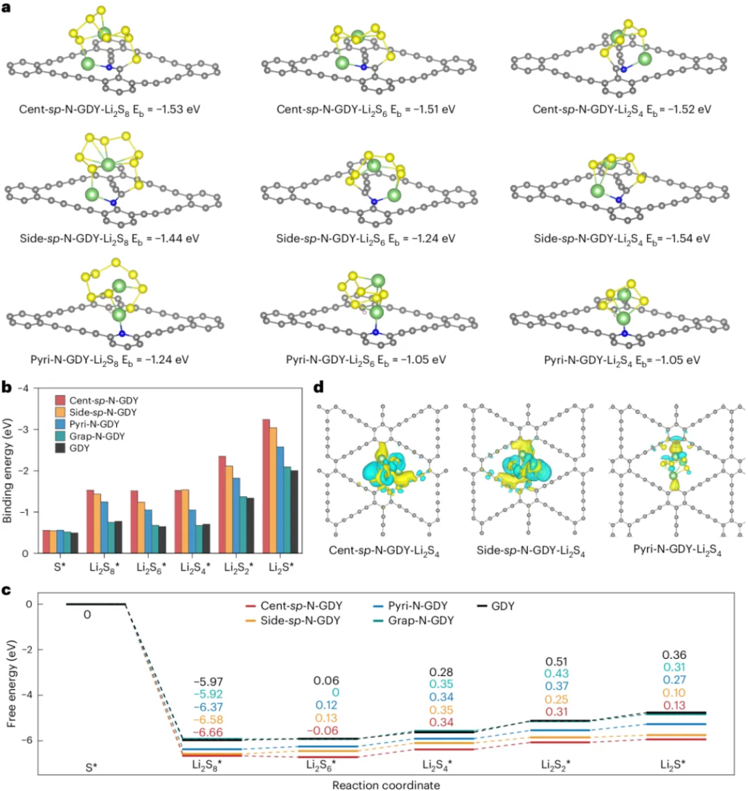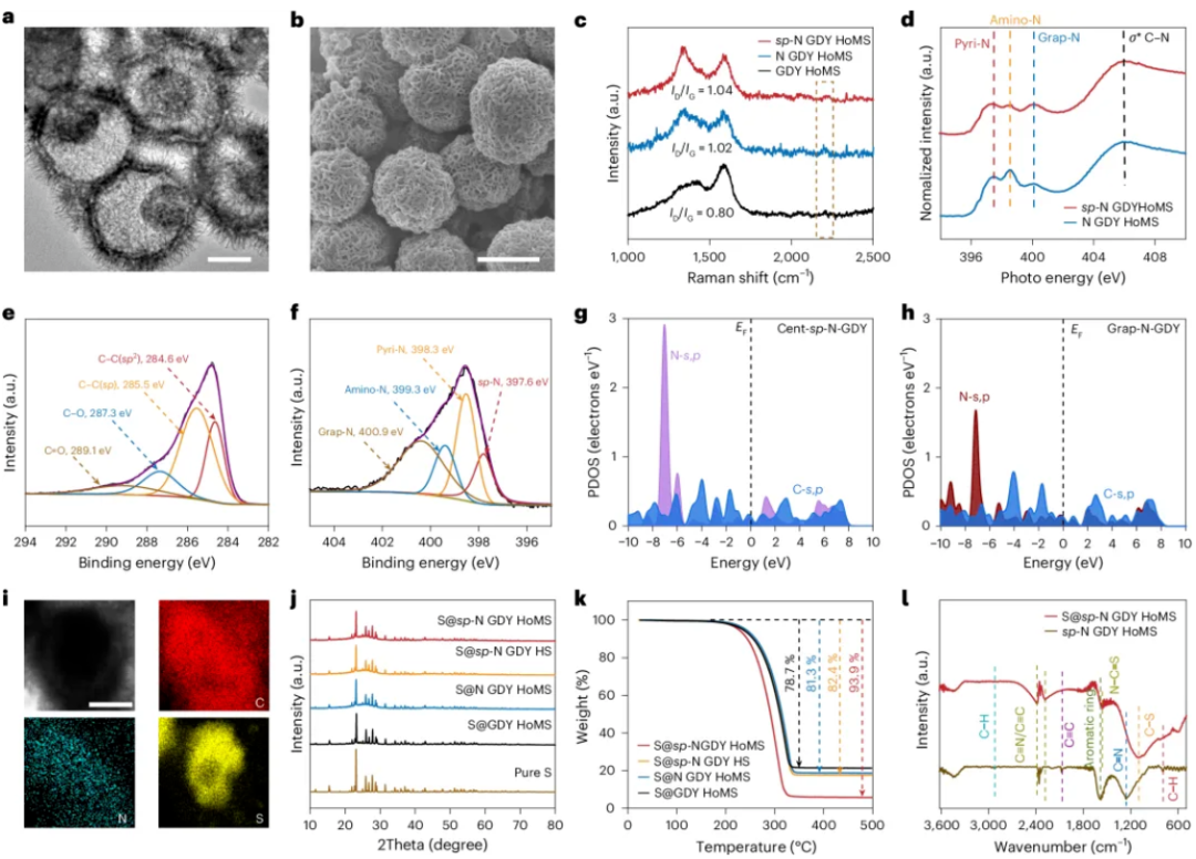 TEM和SEM结果表明,sp-N GDY HoMS由纳米薄片组装而成,具有清晰的中空多壳层形貌和垂直层状壁结构;这一结构为高硫负载、体积变化缓冲和多级空间限域提供了物理基础。Raman、XANES和XPS结果进一步表明,材料中成功引入了sp-N位点,且sp-N在总氮中占比约为17%。理论计算显示,Cent-sp-N位点的s,p轨道与石墨炔骨架之间具有更优的轨道重叠,可显著促进电子转移与电荷重分布。与此同时,硫在中空多壳层内部均匀分布,且与载体之间存在较强相互作用。该图所体现的关键点在于:本工作并非简单构筑了一个载硫中空骨架,而是通过 “中空结构限域 + sp-N电子调控” 的协同设计,建立了一个兼具结构承载与反应调控能力的高效平台。