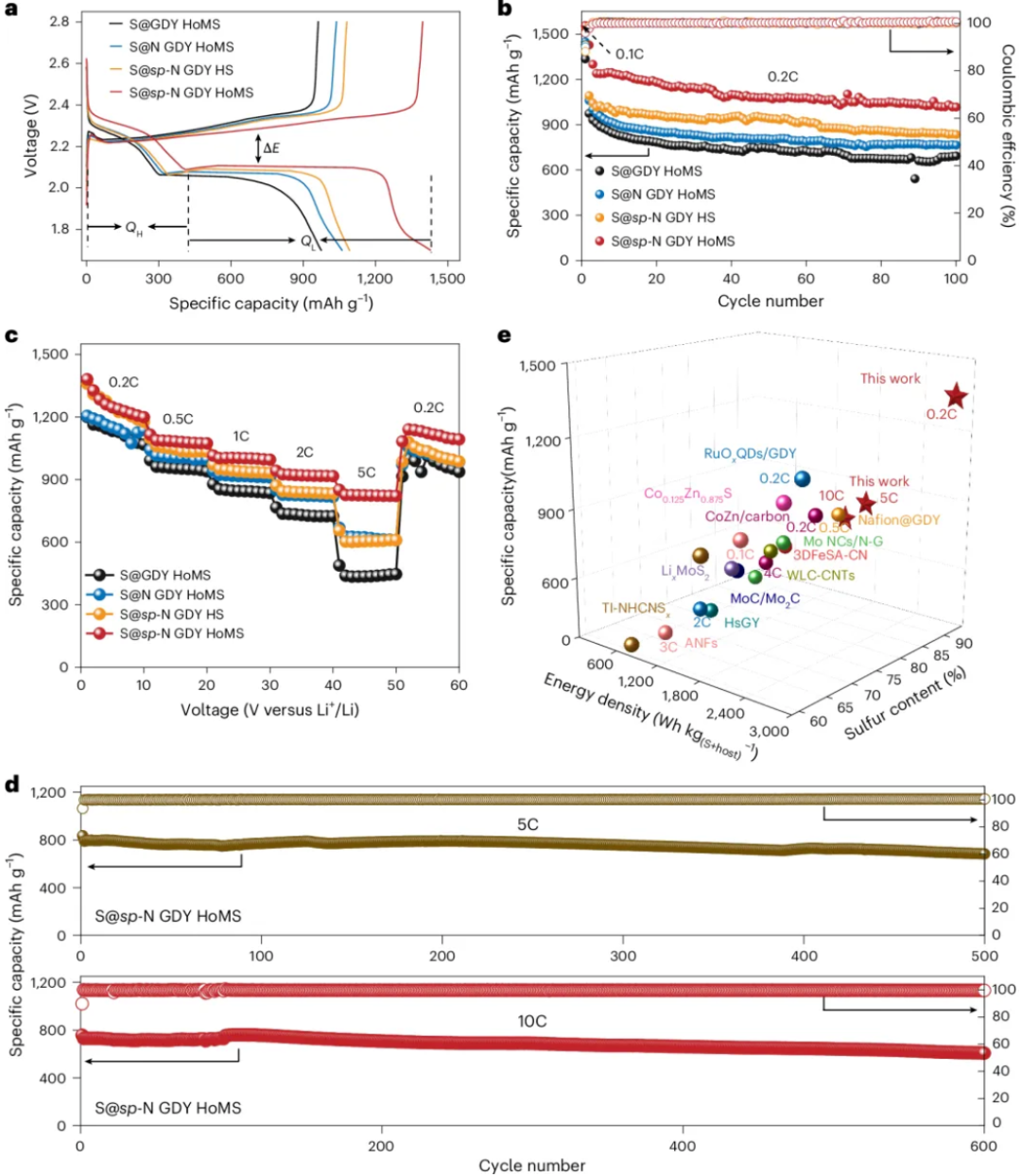 这项工作所解决的核心问题是:稳定性提升不再以牺牲实际能量密度为代价。 在0.2C条件下,sp-N GDY HoMS电极表现出更低的极化和更高的放电平台,显示出更快的硫氧化还原动力学;在0.2C循环100圈后,容量仍保持1014.2 mAh g⁻¹。倍率测试中,该体系在0.2C、0.5C、1C、2C和 5C下分别实现1380.7、1115.0、1014.8、941.8和850.6 mAh g⁻¹,当倍率恢复至0.2C后,容量可回升至1140.0 mAh g⁻¹。更重要的是,在更严格的“硫+HoMS总质量”统计下,该体系仍实现1462 mAh g⁻¹的近理论容量,并在10C条件下维持1384.5 Wh kg⁻¹的能量密度和600 圈稳定循环。这表明本工作真正突破的是锂硫电池长期存在的结构性矛盾:在不显著增加非活性质量的前提下,同时实现高比能输出与长循环寿命。