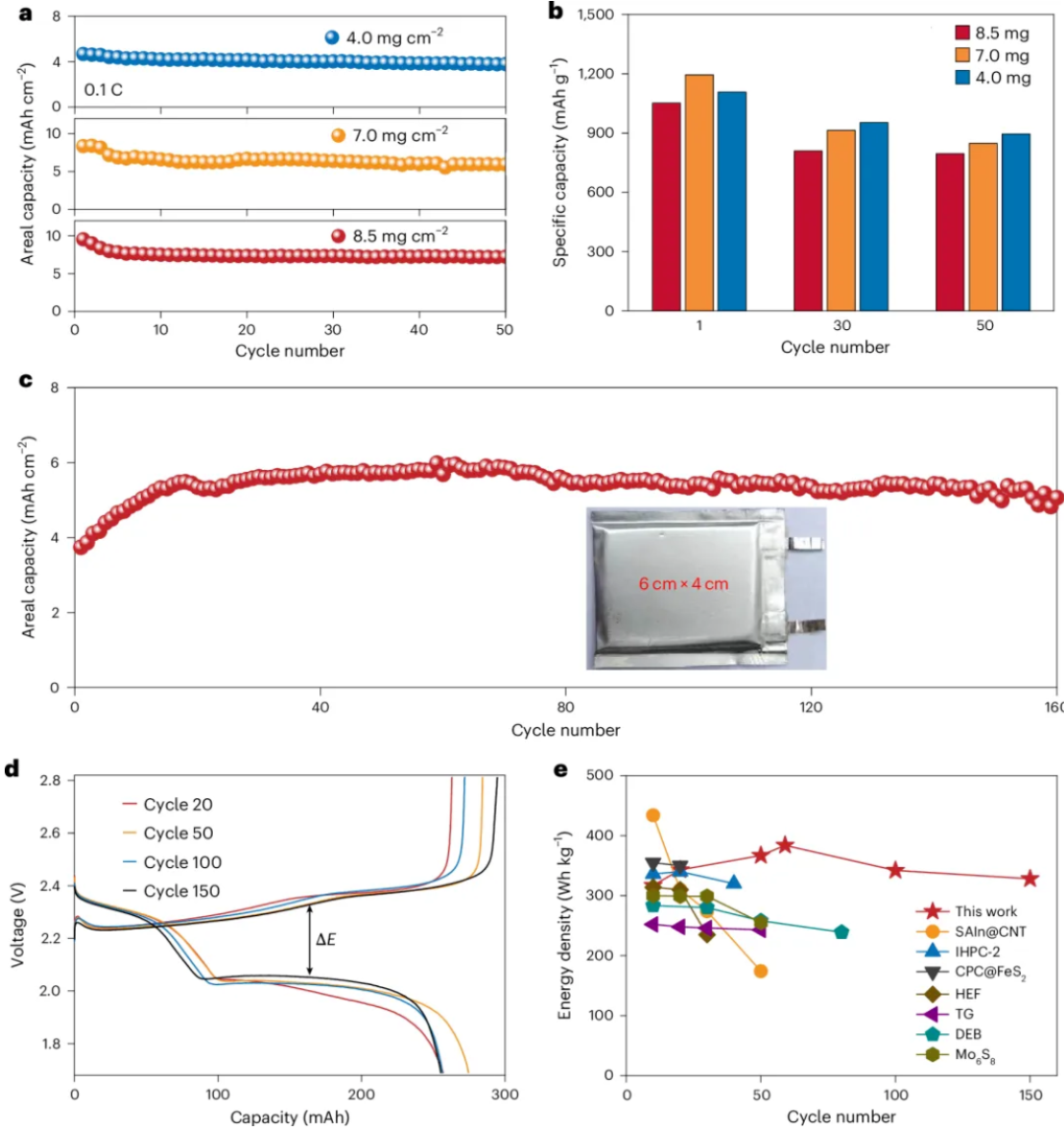 这项工作的突出价值已不局限于材料和扣式电池层面,而是进一步迈向了器件级验证。在较高硫面载量条件下,该体系在4.0–8.5 mg cm⁻²的范围内实现了最高7.2 mAh cm⁻²的可逆面积容量,说明中空多壳层载体在高负载工况下仍具有较高的活性物质利用率。进一步组装的锂硫软包电池,在低电解液/硫比和有限锂负极条件下,实现了约457 Wh kg⁻¹的能量密度;补充数据还给出了两组软包电池的计算结果,其中一组为383.8 Wh kg⁻¹,更大容量器件达到约457 Wh kg⁻¹。同时,器件在弯折状态下仍可稳定点亮LED屏。对于高比能、长寿命、资源高效的下一代储能器件而言,这一点具有尤为重要的现实意义。