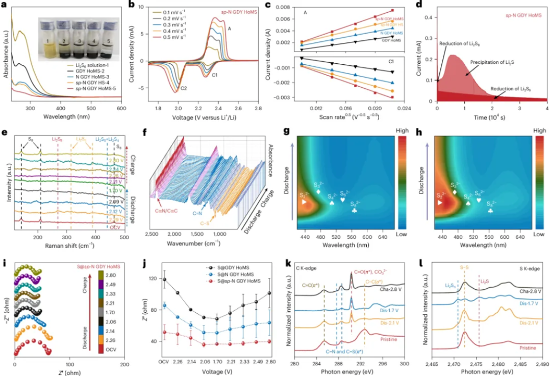 Li₂S₆ 吸附实验和紫外-可见吸收结果表明,sp-N GDY HoMS对多硫化物具有最强的吸附能力,能够更有效抑制穿梭效应;但其价值并不止于“吸附更强”。CV、扩散行为分析和Li₂S沉积实验进一步表明,该体系具有更高的Li⁺扩散能力和更大的Li₂S沉积容量,说明其能够显著促进液-固转化和后续反应动力学。原位Raman、原位FTIR、原位UV–vis和原位EIS则共同显示,在充放电全过程中,该体系具有更低的中间体浓度、更小的界面电荷转移阻力和更平稳的阻抗演化。也就是说,本工作解决的并不是“能否困住中间体”的局部问题,而是进一步实现了多硫化物从被锚定到被快速转化的连续协同,避免中间体在界面积累并演化为新的反应障碍。