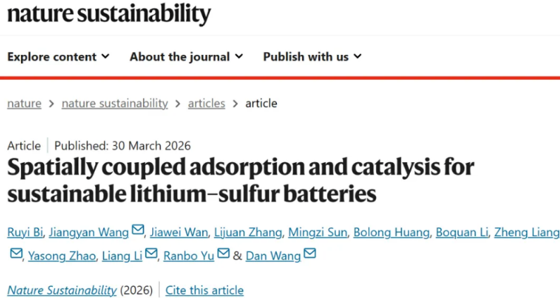 2026年03月30日,深圳大学王丹/于然波教授与合作者在Nature Sustainability期刊发表题为“Spatially coupled adsorption and catalysis for sustainable lithium-sulfur batteries”的研究论文。该工作构建了sp-N掺杂石墨炔中空多壳层结构(sp-N GDY HoMS),通过在同一载体中实现多硫化物吸附位点与催化位点的空间耦合,系统解决了锂硫电池中高比能与长寿命难以兼顾的关键问题。该体系实现了93.9%的超高硫负载、基于硫与HoMS总质量的1462 mAh g⁻¹近理论容量、10C条件下1384.5 Wh kg⁻¹的能量密度与600圈稳定循环,并在软包电池中实现约457 Wh kg⁻¹的器件级能量密度。