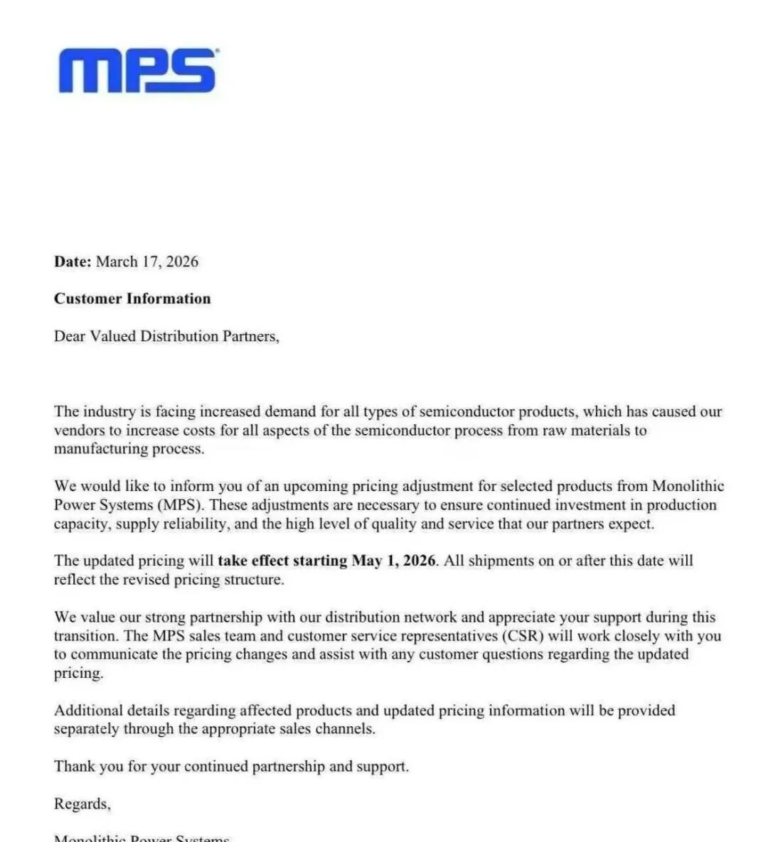 3月17日, MPS(芯源系统)发布涨价函,将于2026年5月1日起对部分产品实施价格调整。