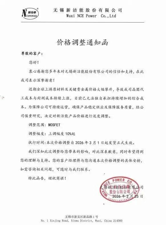 无锡新洁能股份有限公司发布涨价函:公司将对MOSFET产品进行价格上调,上调幅度10%起,本次价格调整自2026年3月1日起发货正式生效。