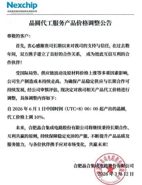 晶圆代工大厂晶合集成(Nexchip)于3月12日向客户发出“晶圆代工服务产品价格调整公告”,宣布6月1日00:00起产出的晶圆涨价10%。