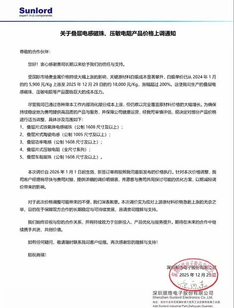 2025年12月29日,顺络电子发布涨价通知,表示将自2026年1月1日起对部分电感磁珠、陶瓷电感、功率电感、压敏电阻及车载磁珠产品进行价格调整。