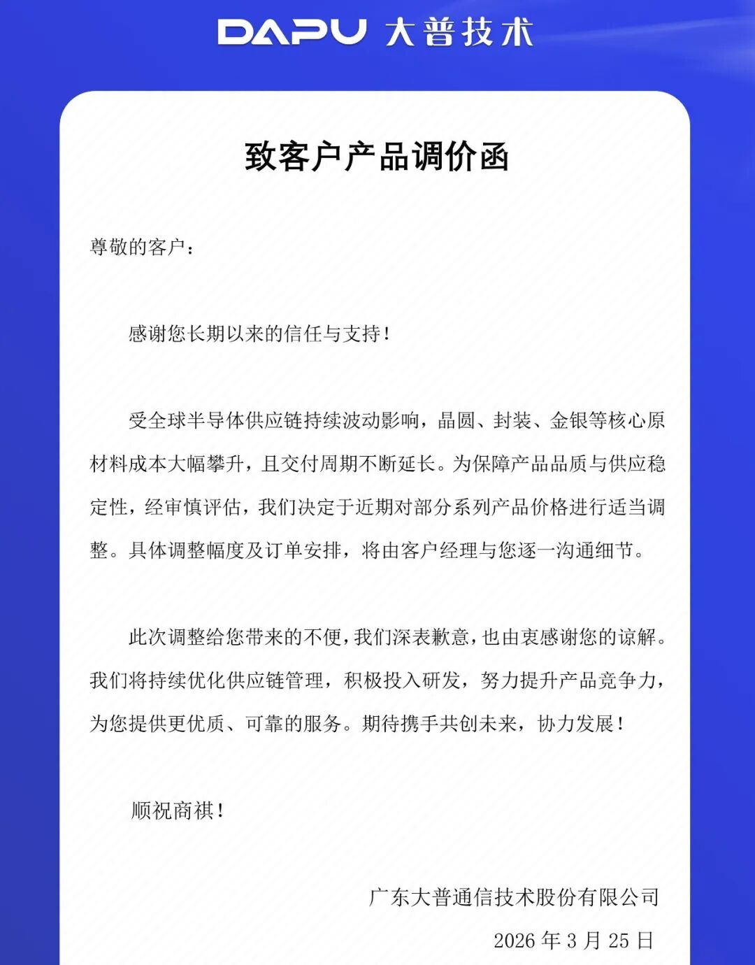 3月25日,大普技术发布产品调价函。