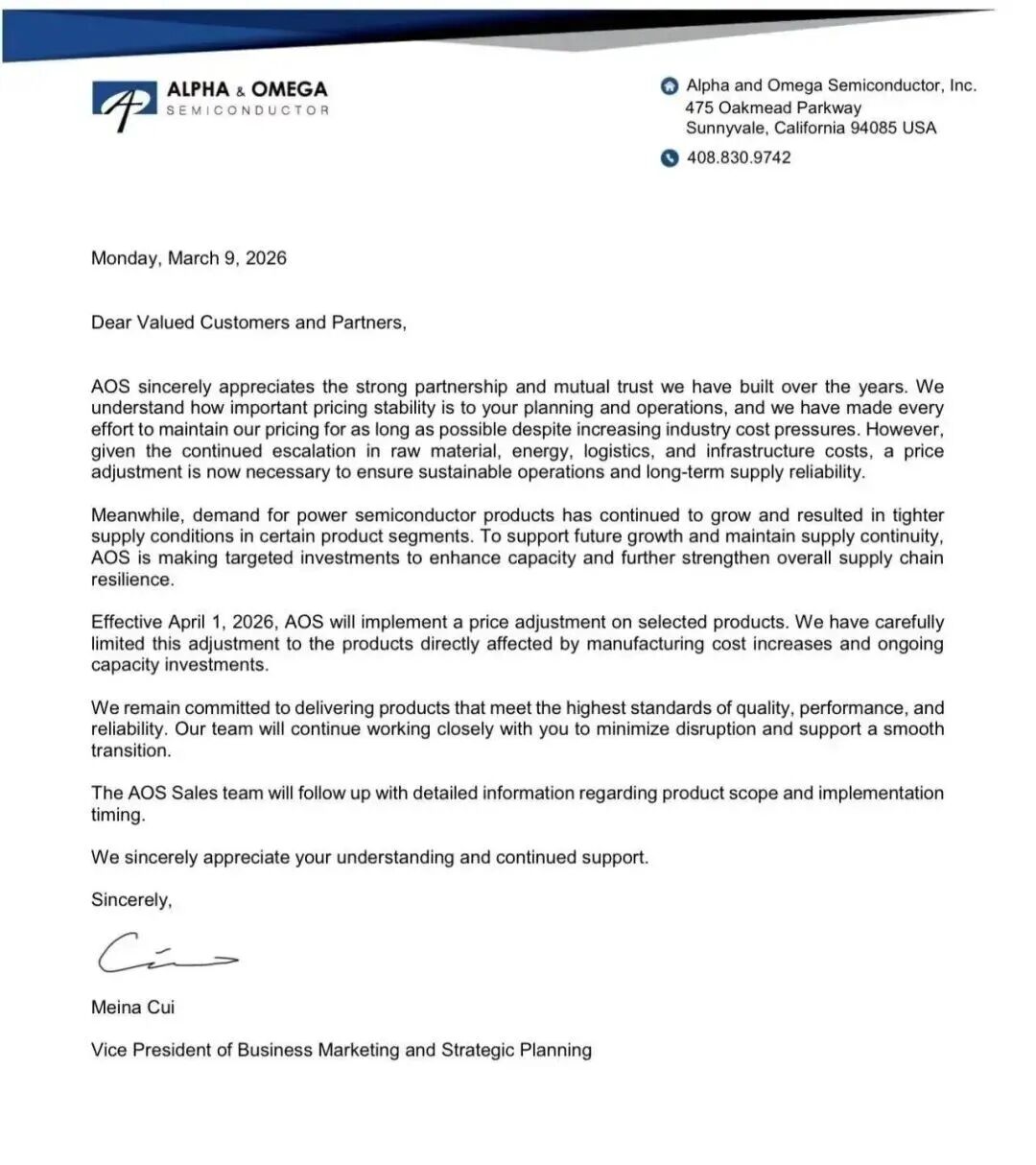 功率半导体厂商万国半导体Alpha and Omega Semiconductor(简称 AOS)于3月发布涨价通知,宣布自4月1日起对部分产品调价。