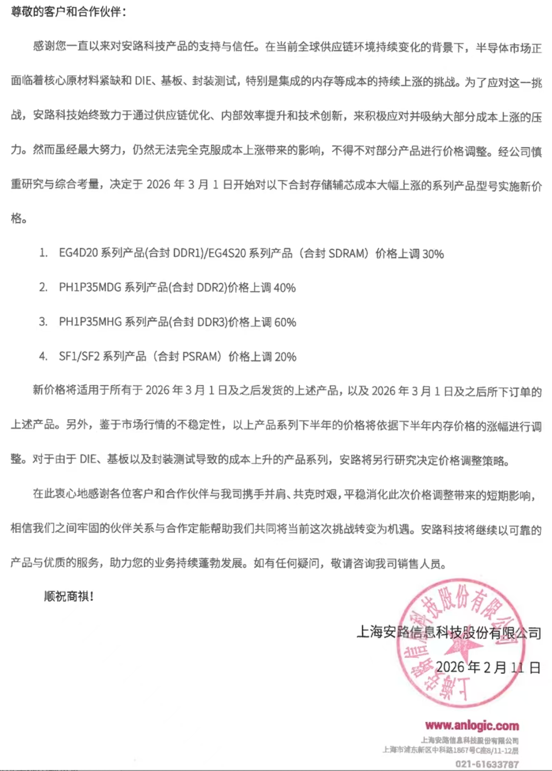 上海安路信息科技股份有限公司发布涨价通知,3月1日起将对合封存储辅芯成本大幅上涨的系列产品型号实施新价格,价格上调20%-60%。