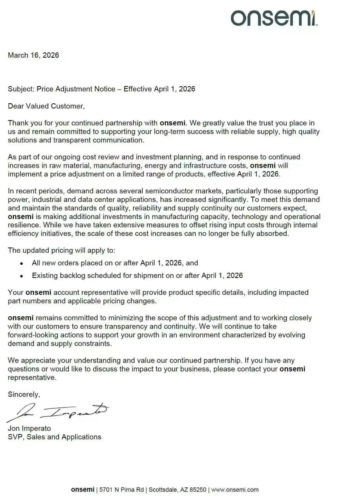 网传安森美于3月16日发布调价通知,4月1日起将对部分产品实施价格调整。
