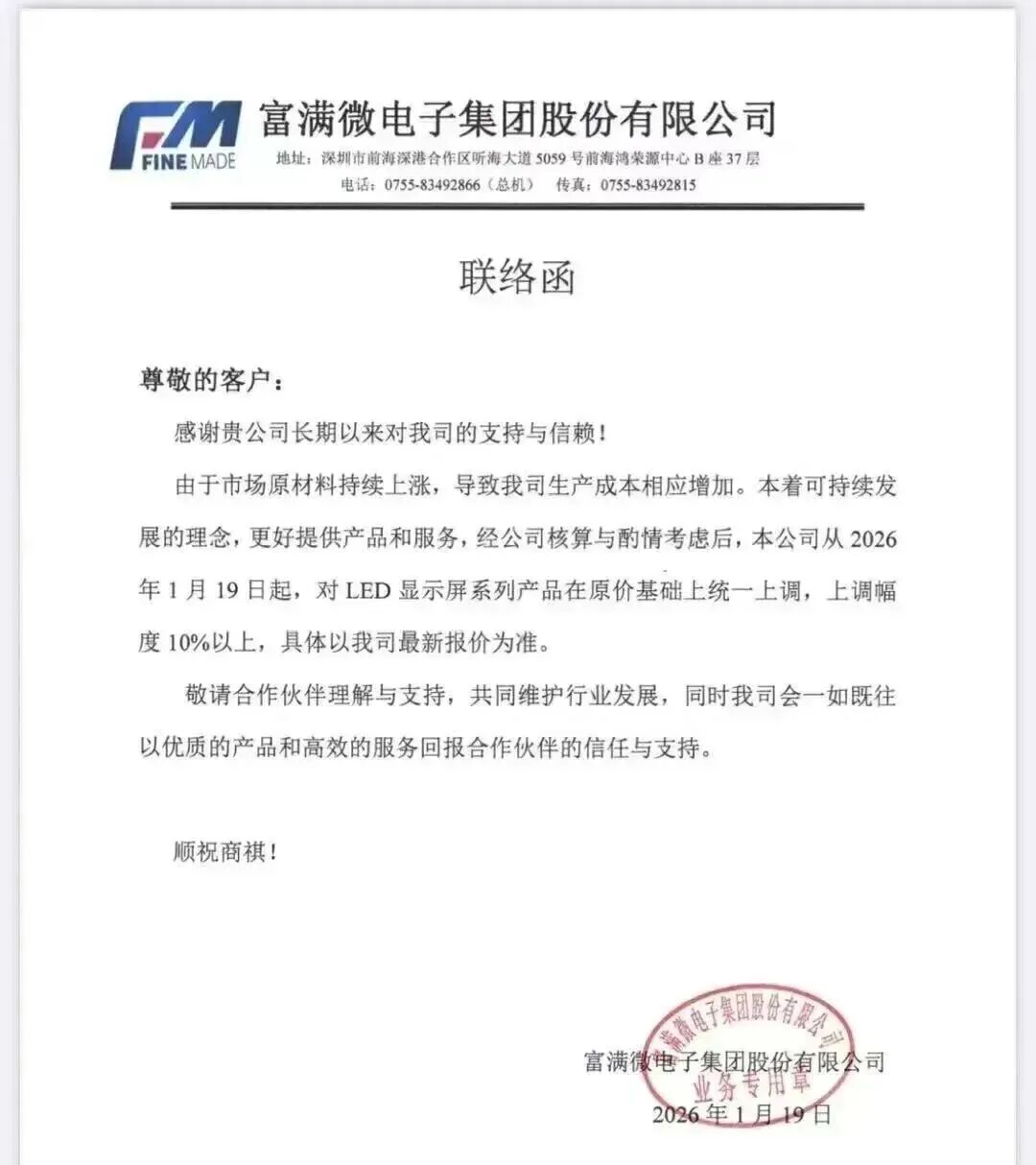 1月19日,富满微电子集团股份有限公司通知,1月19日起对LED显示屏系列产品价格上调,上调幅度10%以上。