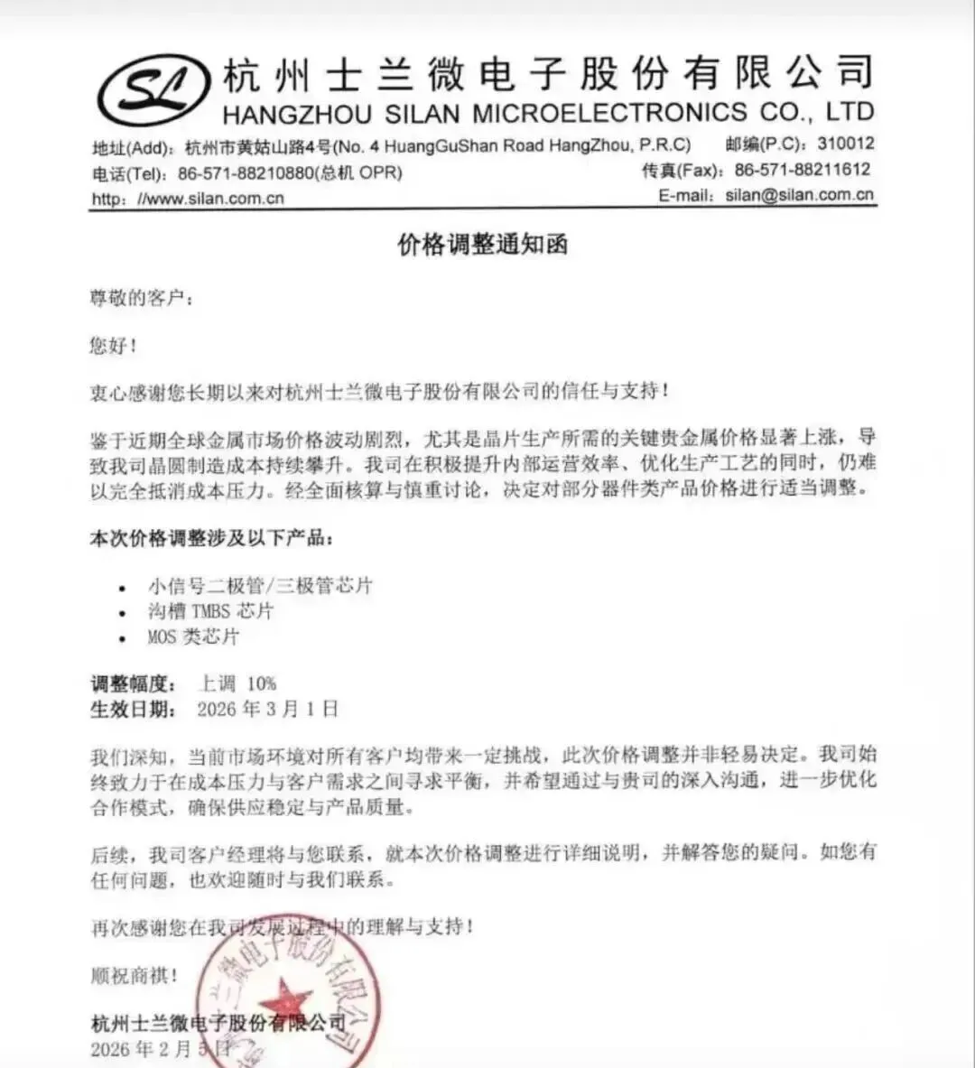 杭州士兰微电子股份有限公司发布价格调整通知函,宣布将对部分器件类产品价格进行上调,调整幅度为10%,自2026年3月1日起正式生效。本次价格调整涉及三类核心产品:小信号二极管/三极管芯片、沟槽TMBS芯片、MOS类芯片。
