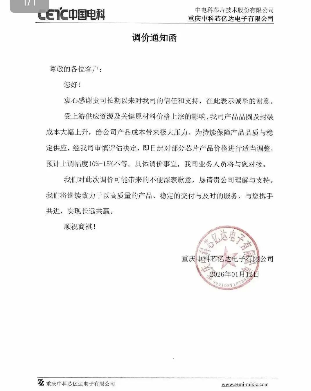 1月30日,美芯晟科技(北京)股份有限公司向客户发出“产品调价通知函”,宣布即日起对相关产品价格进行适度上调,具体调整型号、幅度及执行细节,将由公司销售部门第一时间与贵司专人对接沟通,精准同步相关信息。