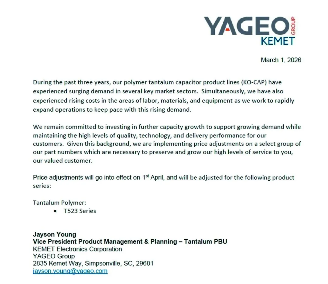 被动元件大厂国巨旗下基美(KEMET)向客户发出涨价通知函,宣布对聚合钽电容产品线(KO-CAP)T523系列调涨价格。价格调整将于4月1日生效。