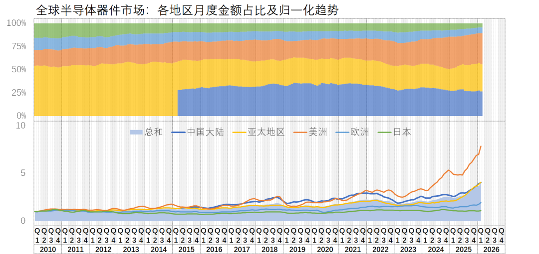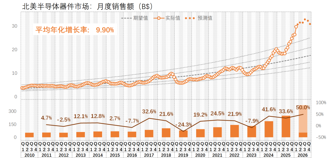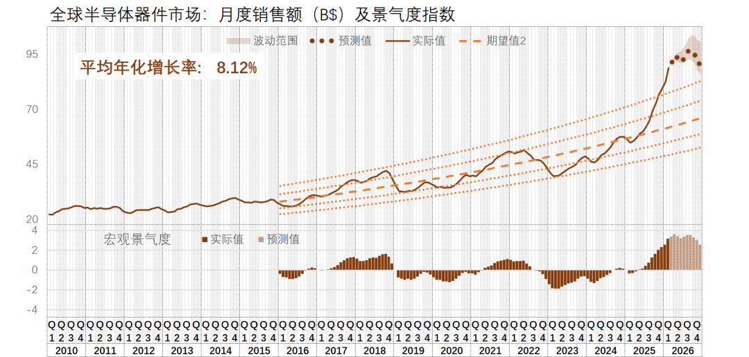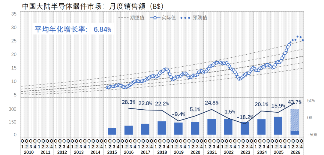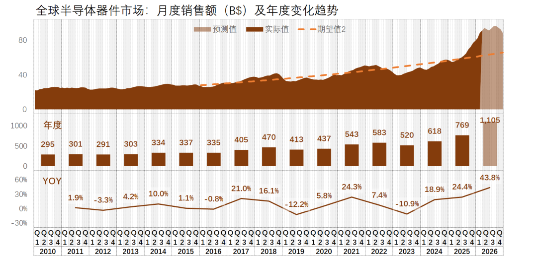 按照我最新的预测(乱猜),2026年全球的半导体器件市场将突破11,000亿美金,年同比涨幅高达43.8%