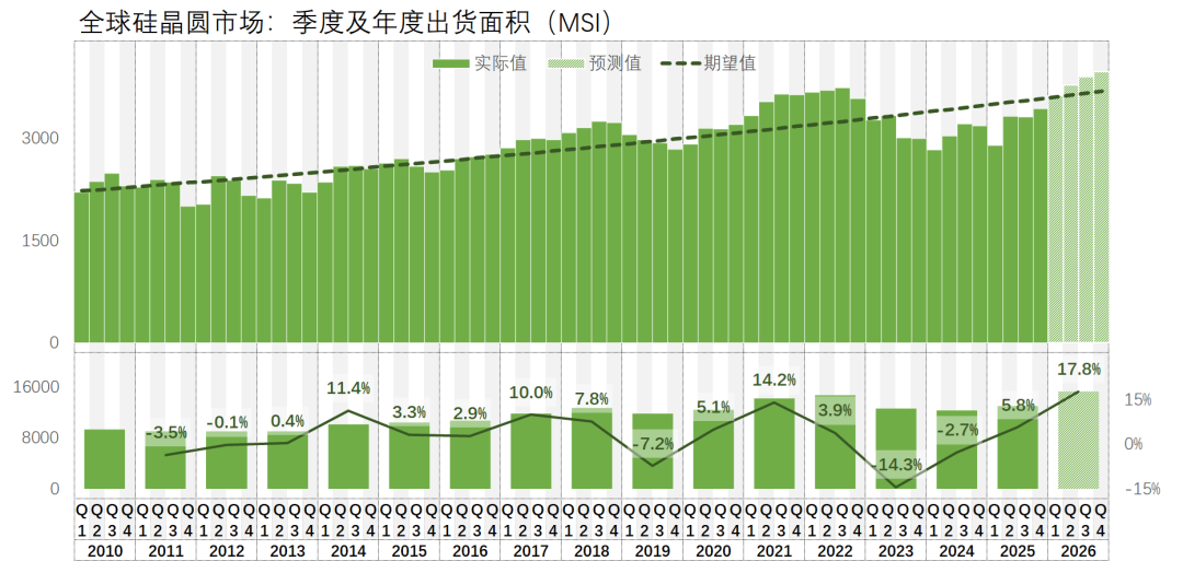 当然,今年全球的晶圆产能也会有一个实质性的增长。按照我最新估计,今年全球大硅片出货面积大约同比增长17.8% -- 这也会打破2010年以来的历史纪录