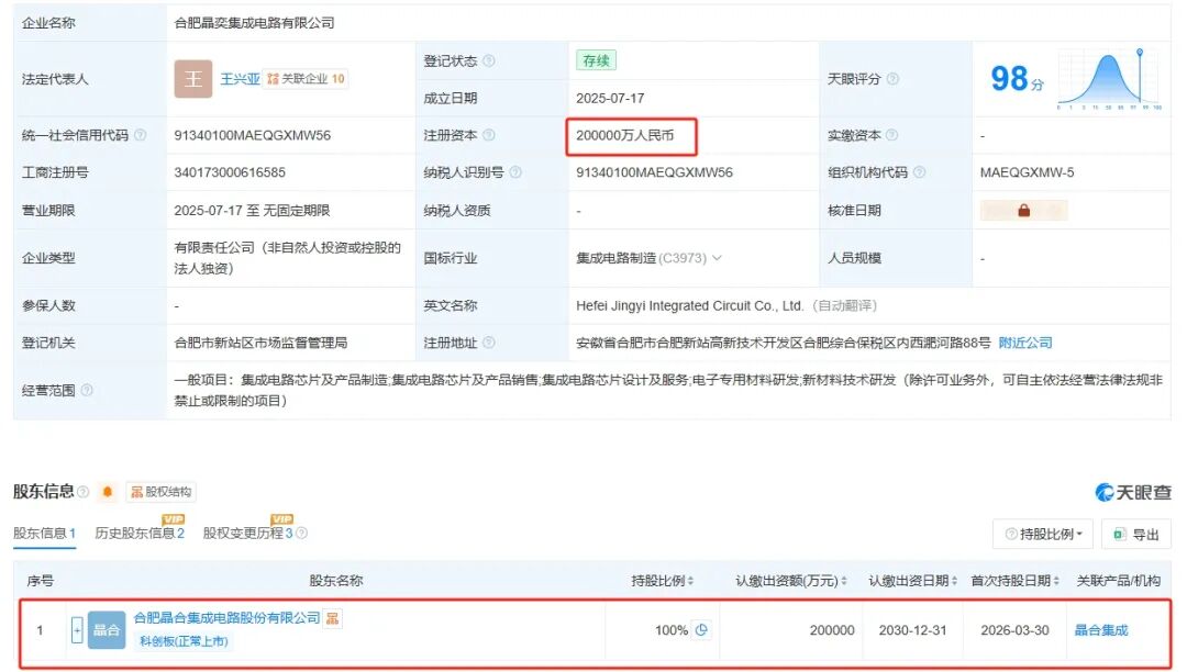 增资子公司方面,近日,晶奕集成工商信息发生变更,注册资本由2000万元增至20亿元,增幅9900%。同时,原股东合肥芯航企业管理合伙企业(有限合伙)、合肥晶策企业管理有限公司退出,新增晶合集成为全资股东。