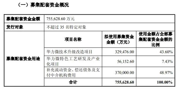 募集配套资金方面,华虹公司拟向不超过35名符合条件的特定对象发行股份募集配套资金,募集配套资金金额不超过75.56亿元。根据公告,此次募集配套资金将主要用于华力微技术升级改造项目、华力微特色工艺研发及产业化项目以及补充流动资金、偿还债务及支付中介机构费用。