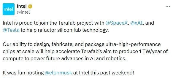 4月7日,英特尔(Intel)在社交平台上宣布,将正式加入特斯拉旗下的Terafab项目。未来,英特尔将与SpaceX、xAI以及特斯拉携手合作,共同制造处理器。