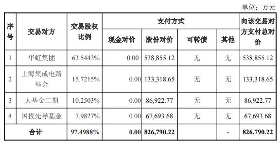 资产收购方面,华虹公司拟向华虹集团、上海集成电路基金、大基金二期以及国投先导基金4名交易对方购买其合计持有的华力微97.4988%股权,交易金额为82.68亿元。