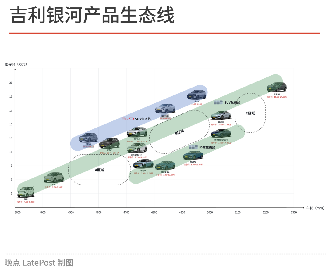 如果把产品连起来看,银河 SUV 产品生态线要低于比亚迪的 SUV 产品生态线,在轿车领域也同理。现有的生态格局中,银河 E5 和星愿之间的 A 区域,星舰 7 和星耀 8 之间的 B 区域以及星耀 8 和 M9 之间的 C 区域还是银河可以发展的空间。