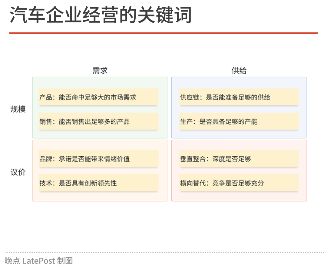 本质上,汽车产业是较重的投资回报游戏,核心的问题是投资于什么方面,能够持续创造回报。当我们追溯汽车企业经营的第一性原理的时候,很容易找到四个关键词:规模与议价、需求和供给,它们构成的矩阵影响了一家企业的好与坏甚至生与死。