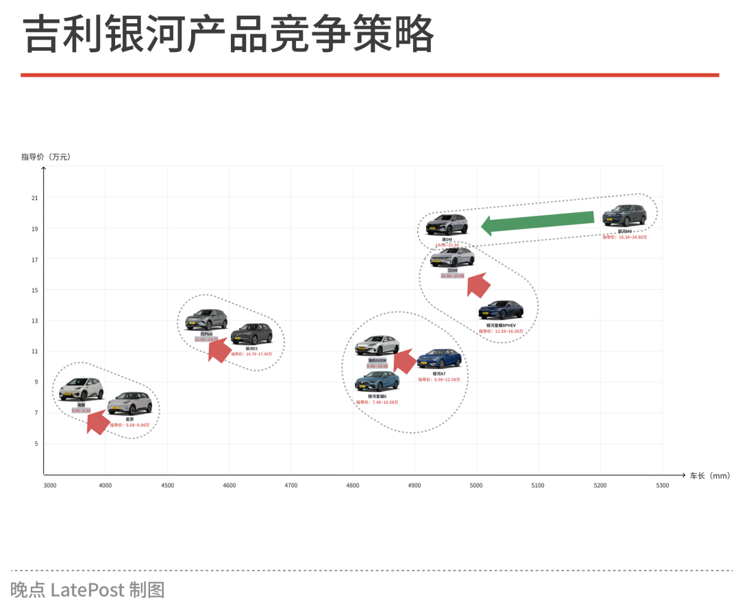 可以预见的是,未来一段时间,银河的产品线一方面要扫除空白区域盲点,另一方面就要像 M9 一样突破比亚迪的压力线,能够塑造出直面的竞争,而不是一味的右下角入场。