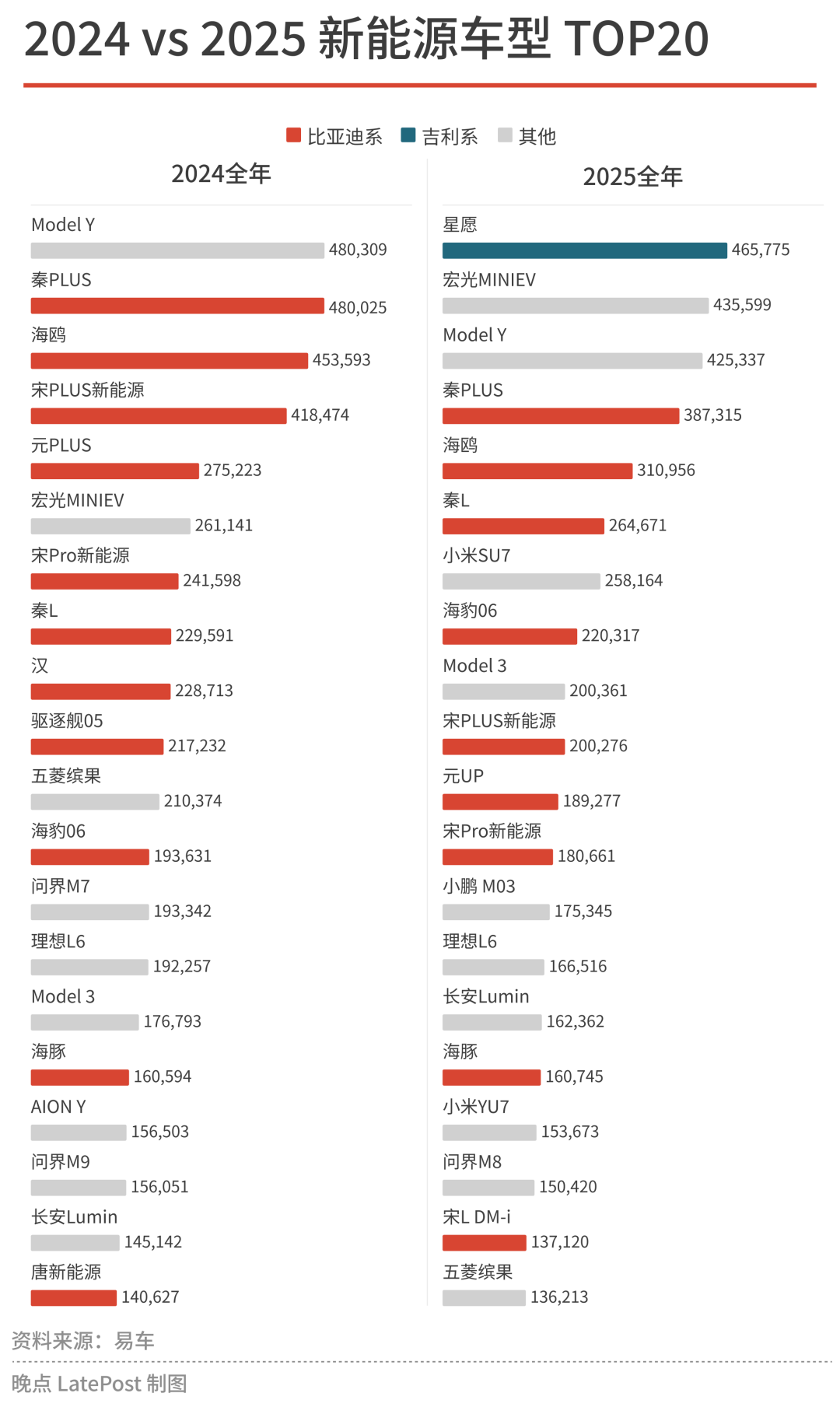 到了 2025 年,全年销量前 20 的新能源产品,BYD 还是有 9 款,但销量占比下降到了四成多点。前十名中,BYD 占位下降到了 5 席,而且前三名无一上榜,吉利星愿却在 2025 年拿下了榜首。