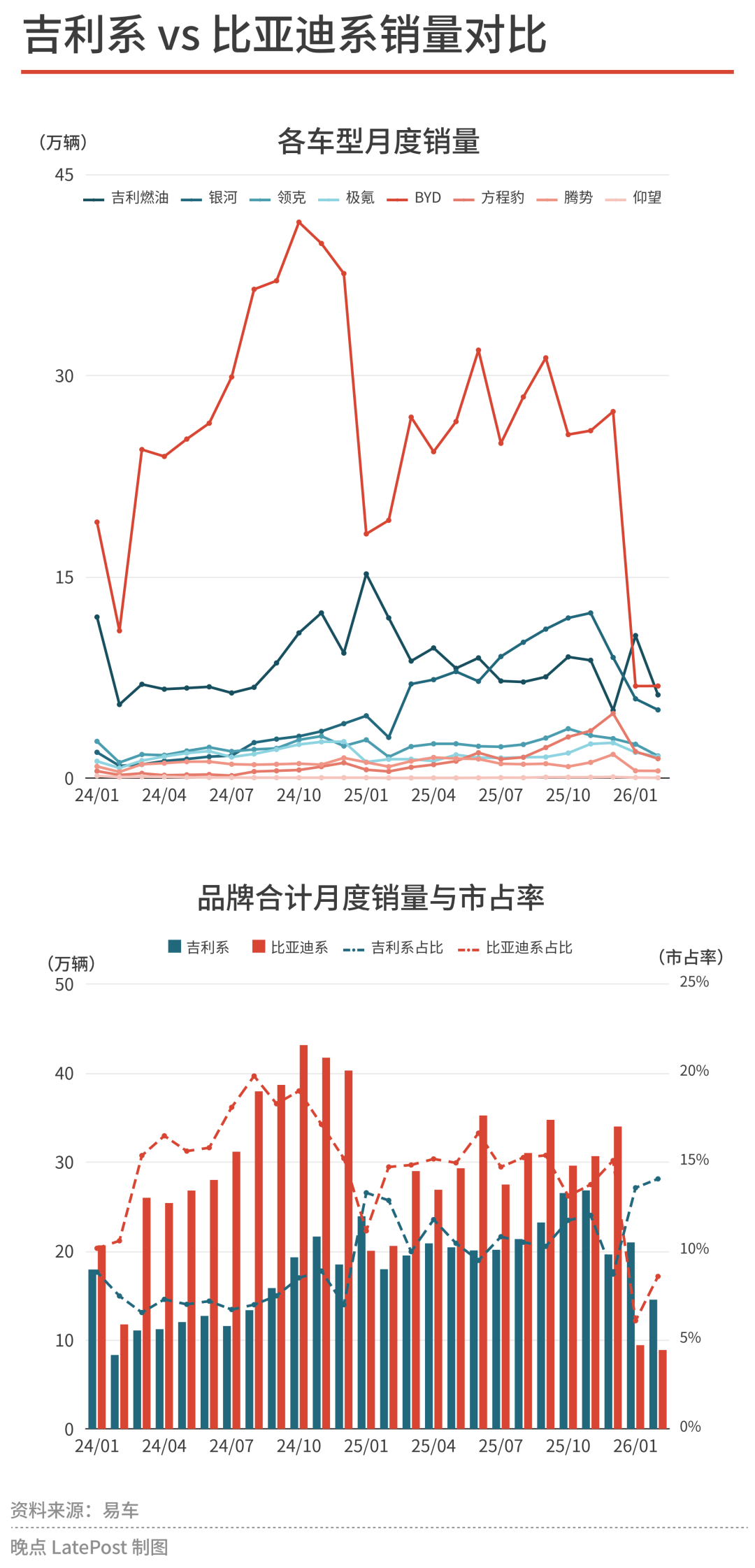 反观吉利,趁此机会,在 2026 年初连续两个月超越比亚迪,登上了自主品牌的王座。