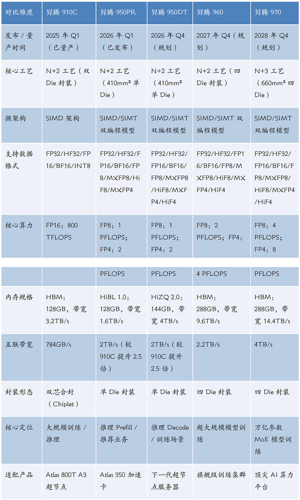 华为昇腾910C至970的迭代遵循“三年四代”战略规划(2025-2028),形成清晰的技术跃迁路径,核心围绕“算力密度、场景适配、国产化自主”推进。