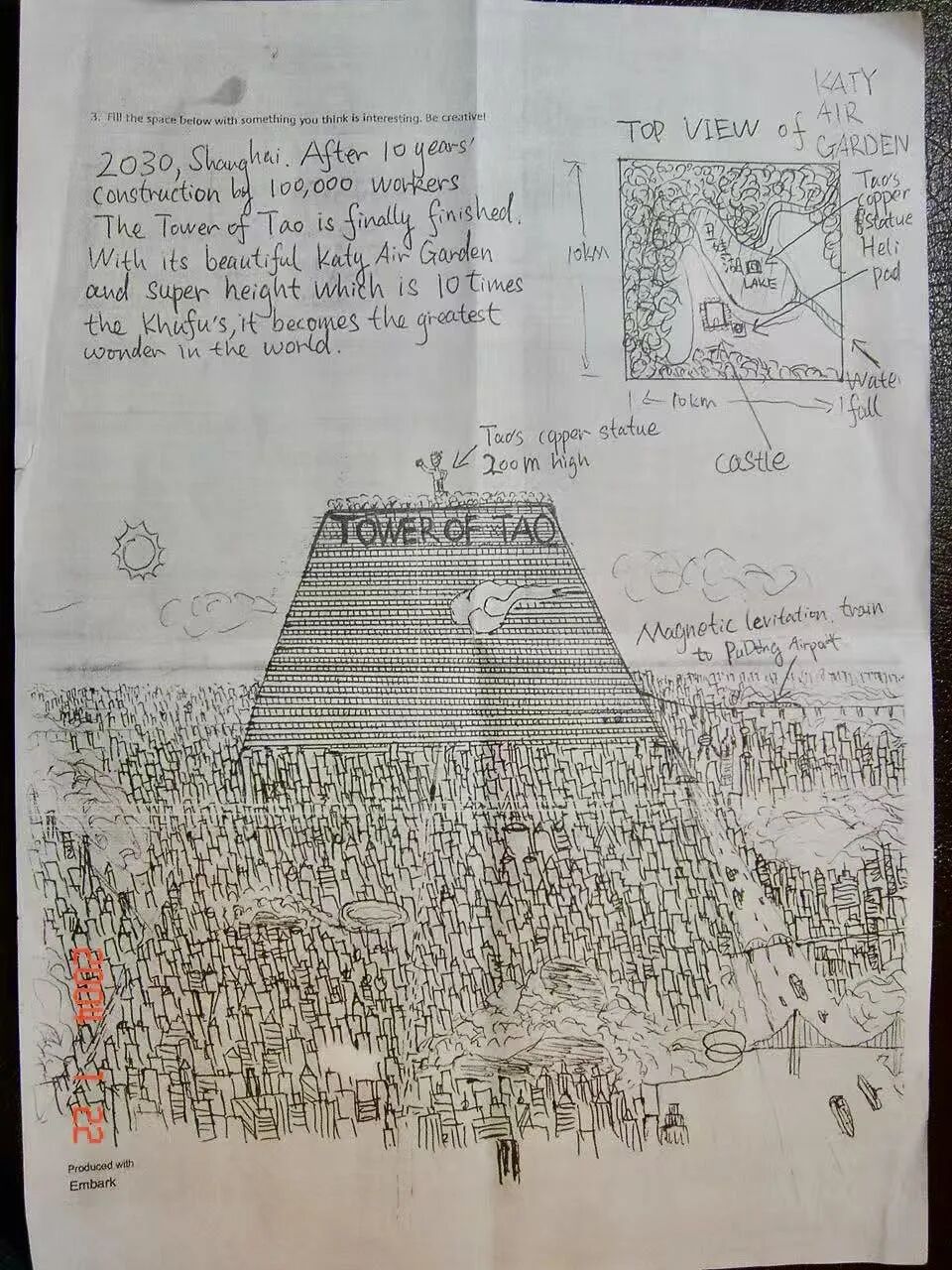 汪滔:我给你看一张我 2002 年画的图。是我当时申请加州理工大学,对方出的题,“Fill the space below with something you think it's interesting,be creative。” 我就画了这么个东西:上海的高楼林立中,耸立着一座巨型金字塔,顶端是空中花园,有瀑布、森林、环湖赛道,还有停机坪。