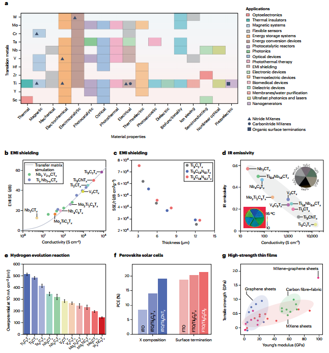 MXenes近乎无限的化学组合空间为其性能调控提供了强大的“设计工具箱”,使其能够针对特定应用进行原子尺度的模块化设计。在电催化领域,M层金属的选择决定了吸附效率:早期过渡金属(如Ti, V)具有适中的氢吸附能,而后期过渡金属(如Mo, W)因费米能级附近电子态密度较高,更有利于HER过程中的电荷转移。在电磁屏蔽(EMI)机械性能方面,通过组装MXenes与石墨烯等材料,可制造出拉伸强度高达1.87 GPa的超强复合薄膜。未来,结合机器学习和高通量实验,这种组成多样性将加速发现更多针对量子技术、空间探索等前沿领域定制的特殊性能MXenes。