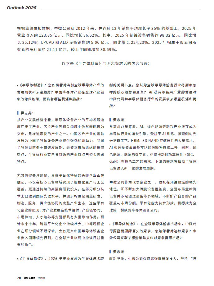 •《半导体制造》:2026年被业界视为半导体技术跨越的关键节点。您认为全球半导体设备行业将面临怎样的核心趋势和变革?AI芯片等新兴产业的发展对中微公司和半导体设备行业的发展带来哪些机遇和挑战?