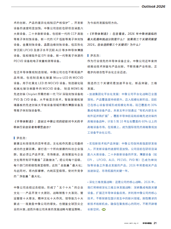 •《半导体制造》:在您看来,2026年中微将面临的最大机遇和挑战分别是什么? 如果用三个关键词展望2026,您会选择哪三个关键词?为什么?