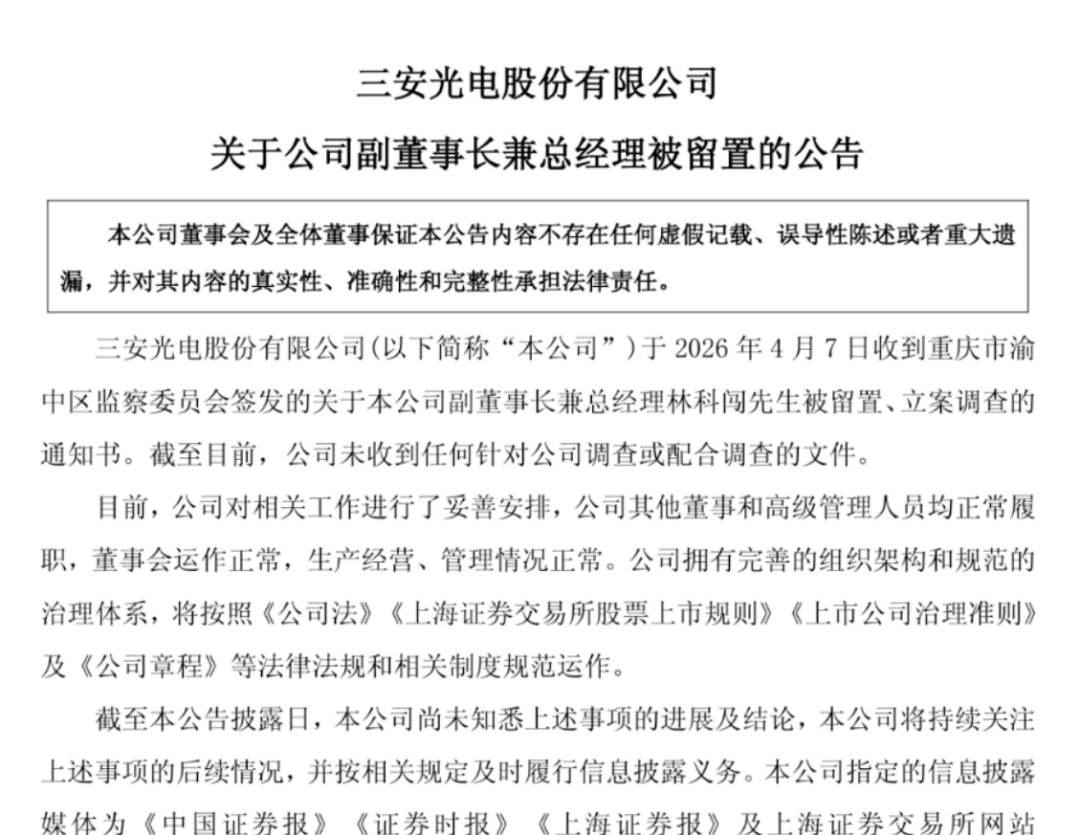 4月8日,三安光电(600703.SH)公告称,公司于2026年4月7日收到重庆市渝中区监察委员会签发的通知书,公司副董事长兼总经理林科闯被留置、立案调查。