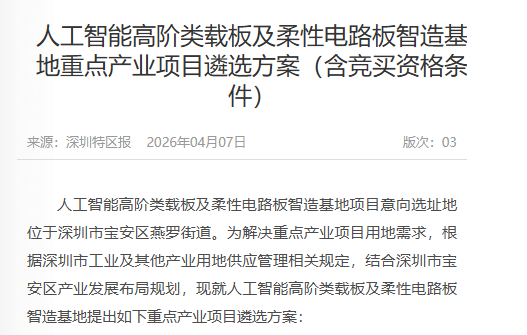 4月7日,《人工智能高阶类载板及柔性电路板智造基地重点产业项目遴选方案》正式对外公示,意向用地单位为鹏鼎控股,意向选址定在深圳市宝安区燕罗街道,项目固定资产投资要求不低于100亿元。