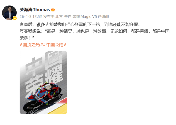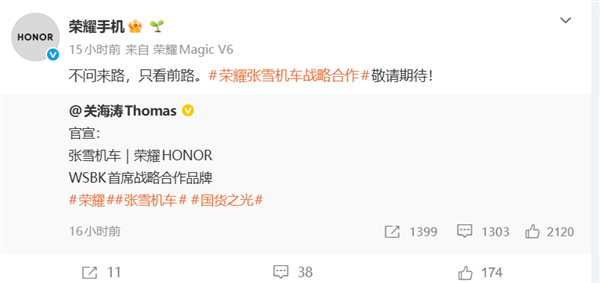 4月8日,荣耀全球首席营销官关海涛正式宣布,荣耀成为张雪机车在世界超级摩托车锦标赛(WSBK)的首席战略合作品牌。这是首个与张雪机车达成合作的中国手机品牌,标志着中国科技企业与高端摩托车制造的深度联动。