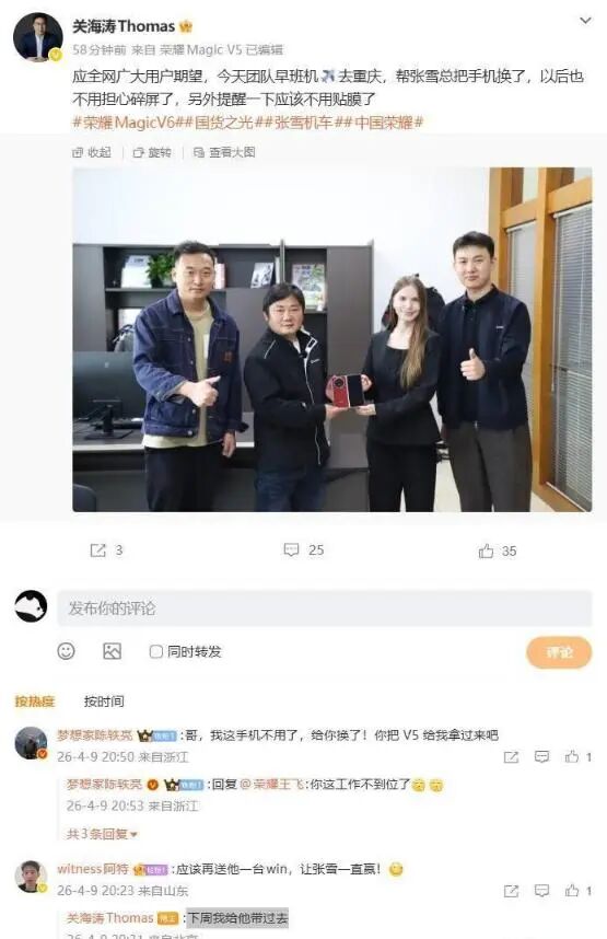 合作官宣后,荣耀迅速行动:4月9日早班机飞往重庆,为张雪更换了一部Magic V6折叠屏手机(赤兔红配色,谢霆锋同款),该机起售价8999元,部分版本突破万元大关。关海涛还表示,下周将为张雪送上寓意"一直赢"的荣耀WIN(售价3999元,内置10000mAh电池)。